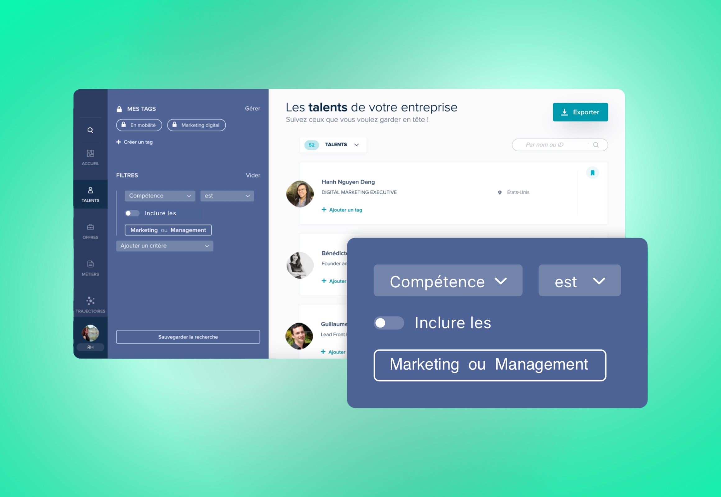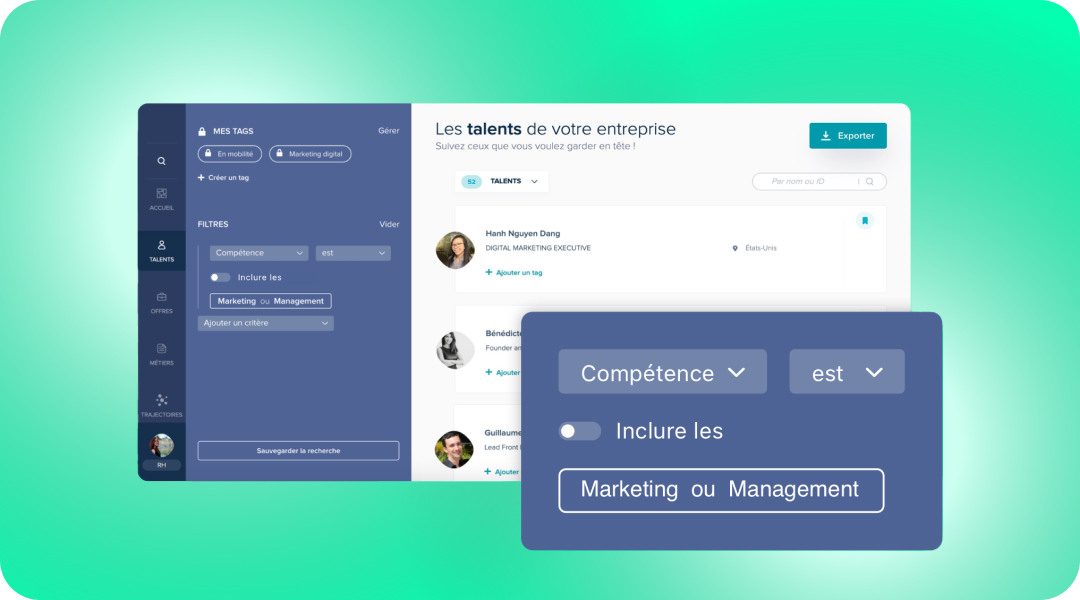 Pouvoir à tout moment trouvez LE talent qu'il faut pour un poste grâce à un système de recherche avec filtres et possibilité de créer des viviers pour encore plus préciser et accélérer les résultats de recherche.