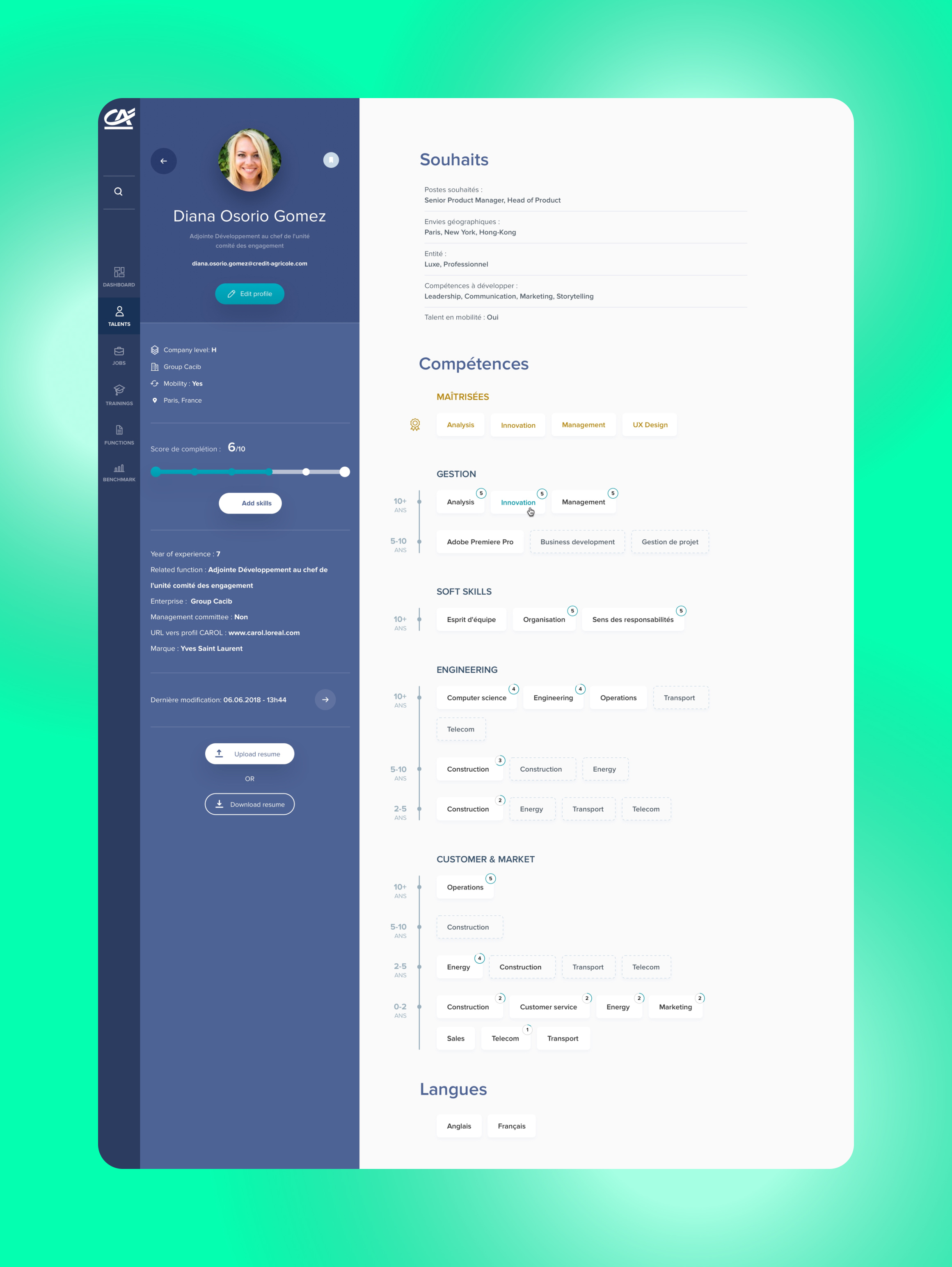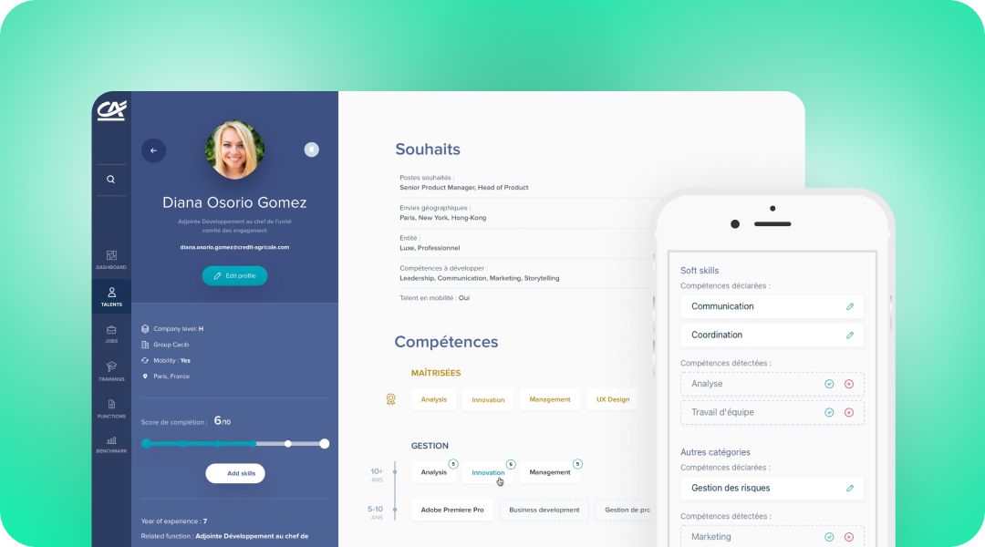 Permettre aux employés ainsi qu'à leurs managers de créer un profil personnalisé afin de référencer les compétences techniques mais aussi les compétences dites "comportementales", et de préciser leurs souhaits de carrière et de mobilité.