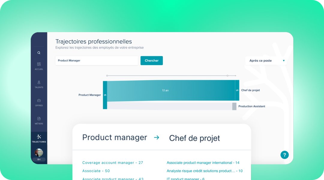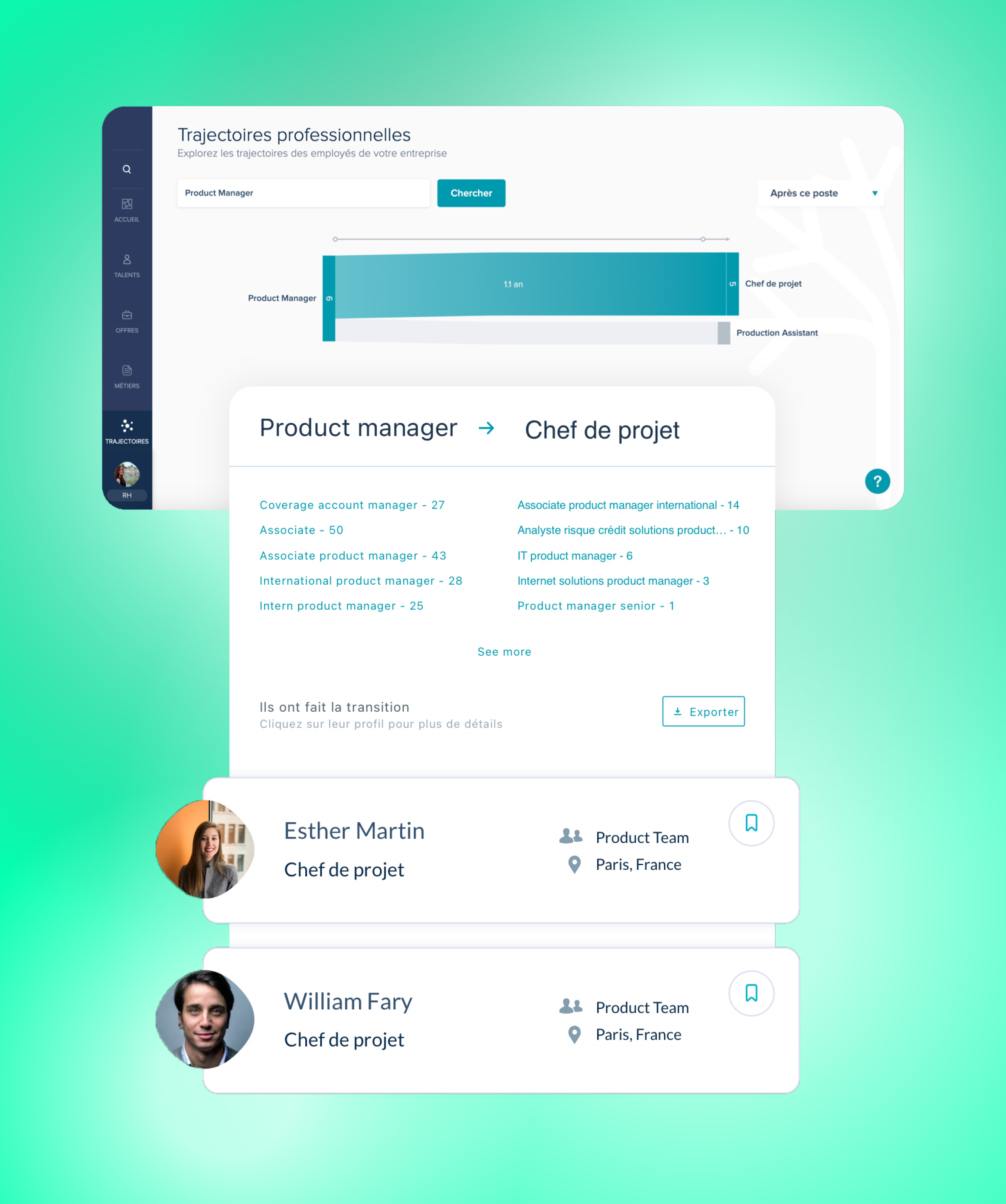 Cette fonctionnalité permet aux collaborateurs de visualiser facilement et rapidement combien de personnes dans l'entreprise ont évolué sur un poste précis, et fournit le détail des trajectoires professionnelles de chacune des personnes référencées : par quels métiers sont-elles passées avant d'atteindre ce poste ? Quelles compétences ont-elles en commun ? Cette fonctionnalité a été pensée pour faire gagner du temps au collaborateur qui n'a plus besoin d'éplucher lui-même les CV de ses collaborateurs, ainsi que pour optimiser l'entraide et le renforcement des liens humains en interne.