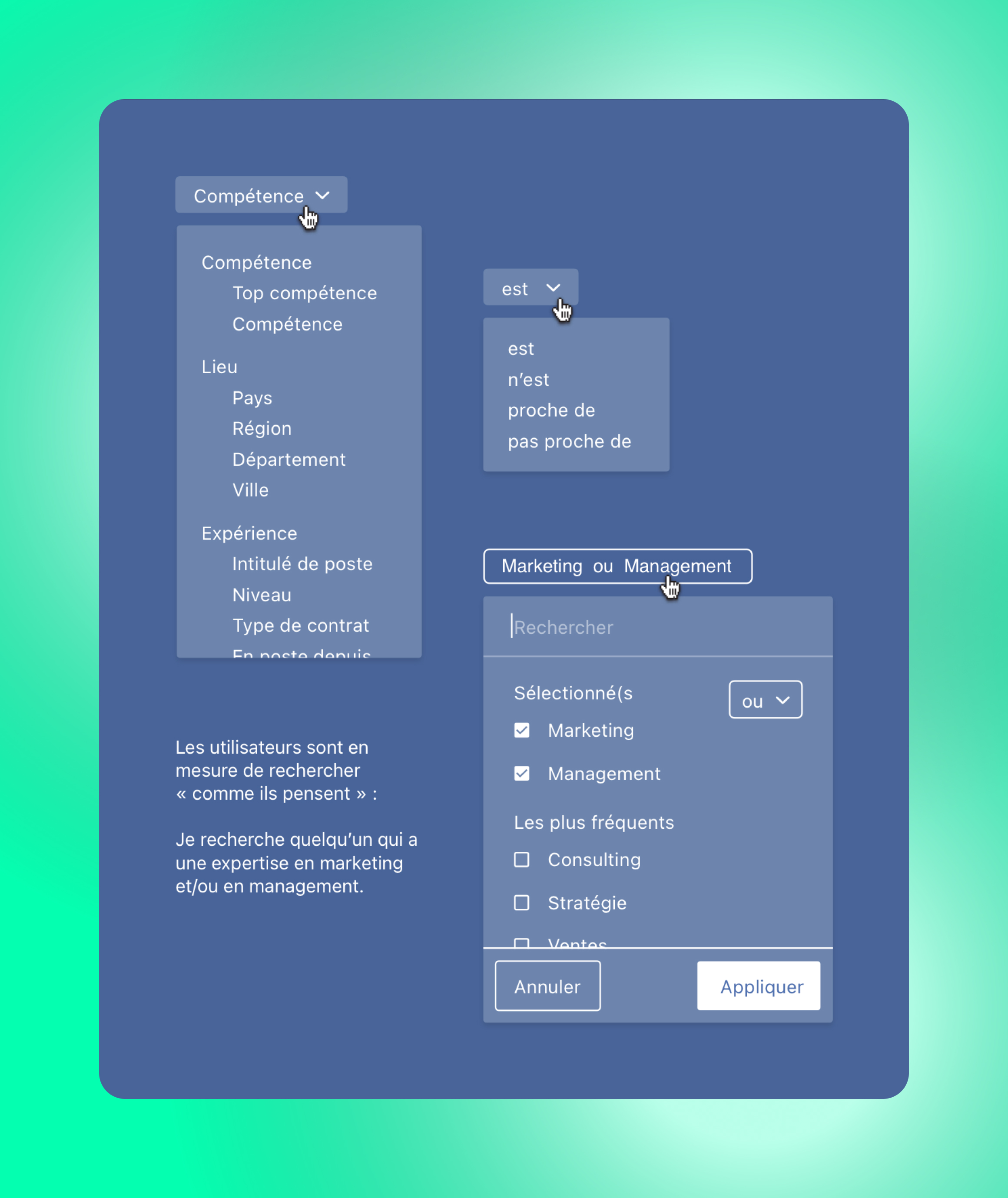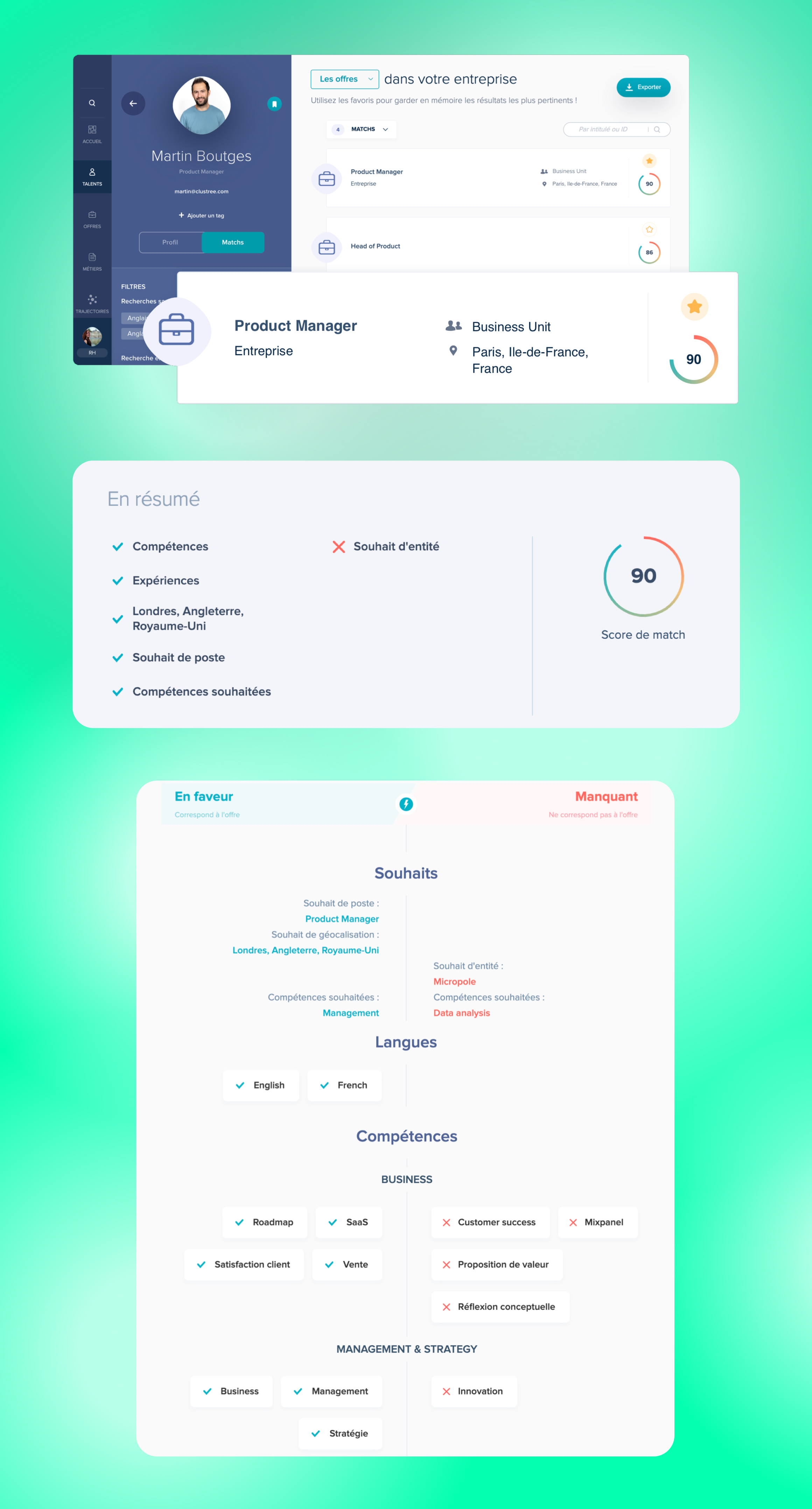 Offrir à l'utilisateur un système de matching inspiré des applications de rencontre afin de proposer des offres / talents qui coïncident avec le besoin en amont, avec un récapitulatif précis des concordances.