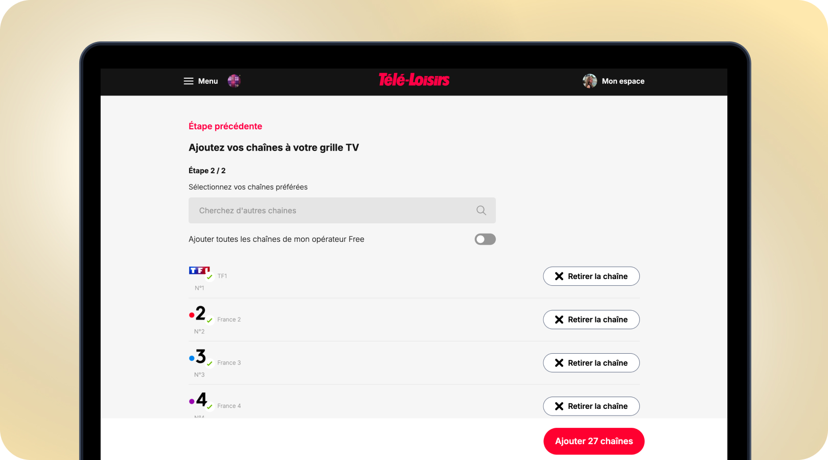 Permettre aux utilisateurs d'ajouter ou de supprimer les chaînes de leur choix sur la grille et d'enregistrer ces paramètres par défaut pour optimiser leurs futures visites.